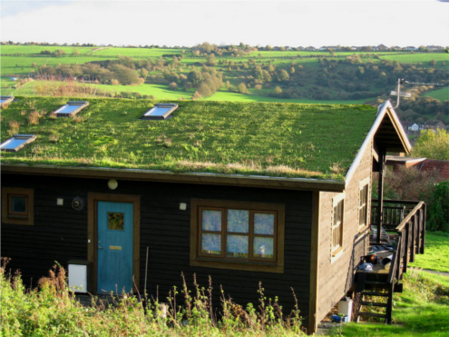 You don’t have to have a flat roof to have a green roof. There are pitched-roof systems that use cleats and mesh to hold the planting medium in place without compromising the membrane roof with fasteners. Sedum mats are now sold like sod, so you don’t have to wait long for your roof to come into full bloom!