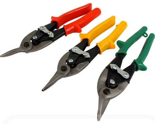 Tin snips are designed to cut curves in only one direction, so be sure you check the package to be sure you buy the ones you need. Red handles mean the snips cut to the right, curling off the waste to the left. Green handles cut to the left, and yellow handles are for straight cuts AND notching. But they’re all designed for right-handed use.