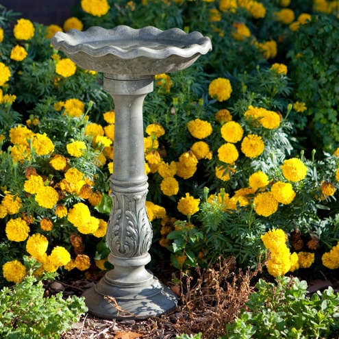 For the smaller garden, consider something like the Campania International Songbird’s Rest Cast Stone bird bath from Hayneedle. Combining a compact design with the authentic look of antique stone statuary, it is perfect for small spaces and—at $54.99 (reg. $82.99)—for all budgets.