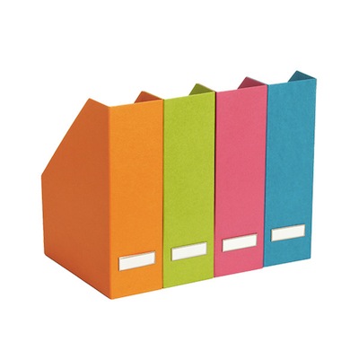 Another great way of keeping your desk organized is to use standing folders. Those pictured above are from the Container Store and cost only $7.99 apiece; invest in a set and your desk surface will remain clutter-free and actually usable for projects (instead of buried under papers).
