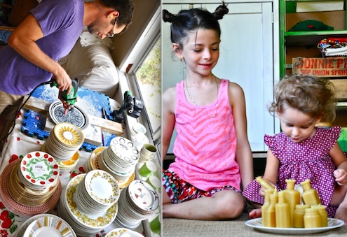 Fresh Pastry Stand has officially taken over the apartment above the carport at Deva Mirel’s Alachua, FL home. In one area of her studio, Deva is designing 350 china display stands for an upcoming flash sale on Fab.com. In another, she’s developing her first wholesale line of beeswax candles shaped and textured like old embossed glass bottles. (Deva recently got funding from a Kickstarter drive.) Much of the floor space and a good many surfaces are devoted to the vintage plates, antique glass, and other collectible household items awaiting creative reinvention.