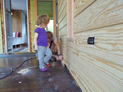 We continued installing the siding down the wall, working around the window opening (which will eventually house a piece of frosted privacy glass) and the door. Nikki and Marc didn’t have any extra trim on hand, so we were only able to install the trim to the right of the door.