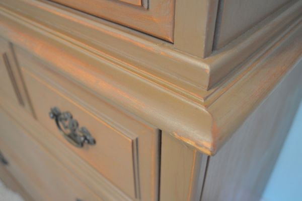 This highboy dresser was in pretty bad condition. The old finish was dingy, stained, and in desperate need of a makeover. The dresser is for a little boy's nursery, so we chose brown, a nice masculine color.
