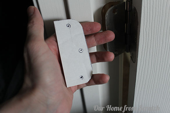 I remove the three screws that hold the hinge to the door jamb. You don’t need to remove the hinge from the door, just the jamb. Then, I hold a piece of cardboard behind the hinge plate and trace the outline of the hinge and mark the hole locations.