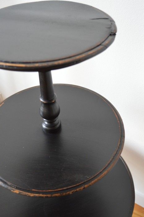 This black table is one of my most recent projects. It was not in perfect condition to start with. Some of the veneer had pieces missing, and there was a crack on the top tier. Instead of trying to fill in those areas, I embraced them. Below are the steps I took when painting and distressing this piece of furniture: