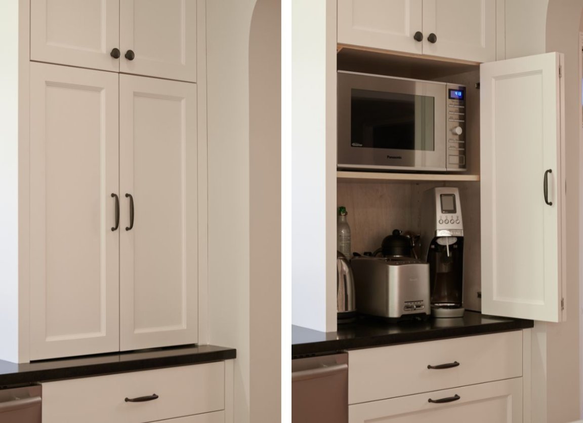 An appliance garage keeps blenders, air fryers, and other small kitchen appliances within easy reach without cluttering your countertops.