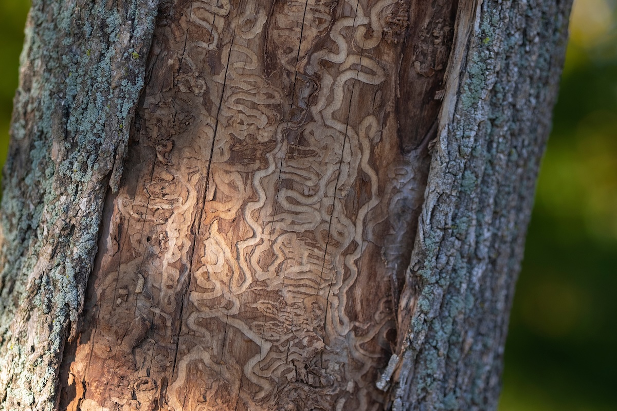 - Increased woodpecker activity. “They will strip the outer bark off to get to the larvae, causing the upper branches and stem to appear lighter in color,” says Holcomb. This is often referred to as blonding.