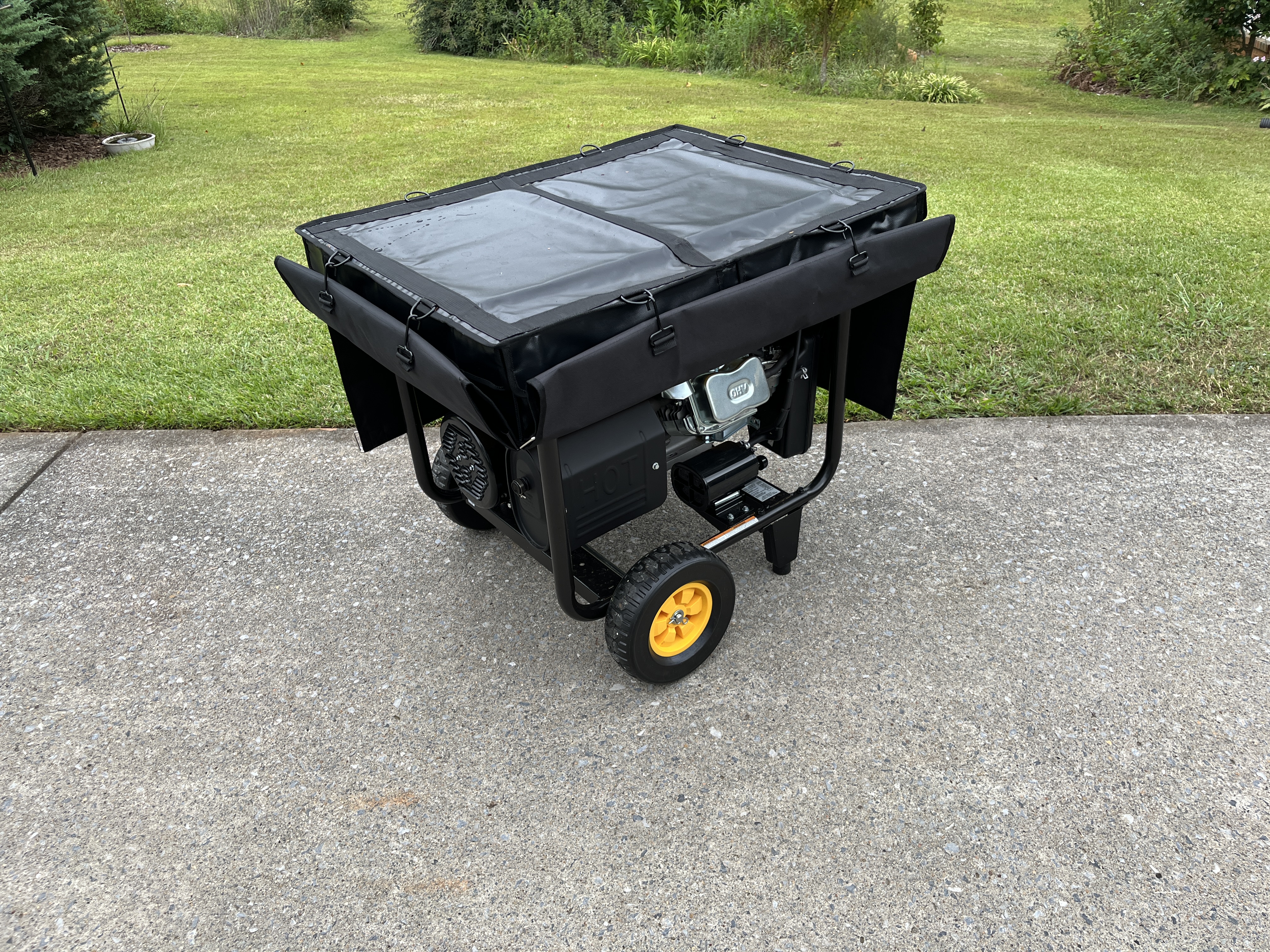 This cover’s tool-free installation made it easy to set up. The frame uses friction-fit nylon corner moldings and short sections of steel tubing that thread together. The frame was anchored to the generator frame with hook-and-loop straps. The side panels arrived preassembled as a single unit that fit perfectly over the steel frame, secured by eight Velcro straps. Finally, the top panel was attached to the side panel assembly with a Velcro perimeter strip. The material quality, fit, and finish were excellent. The design accommodated our generator’s fold-down handle and wheels, and the top panel featured a creased centerline that allowed us to raise the end over the fuel tank for easy filling.