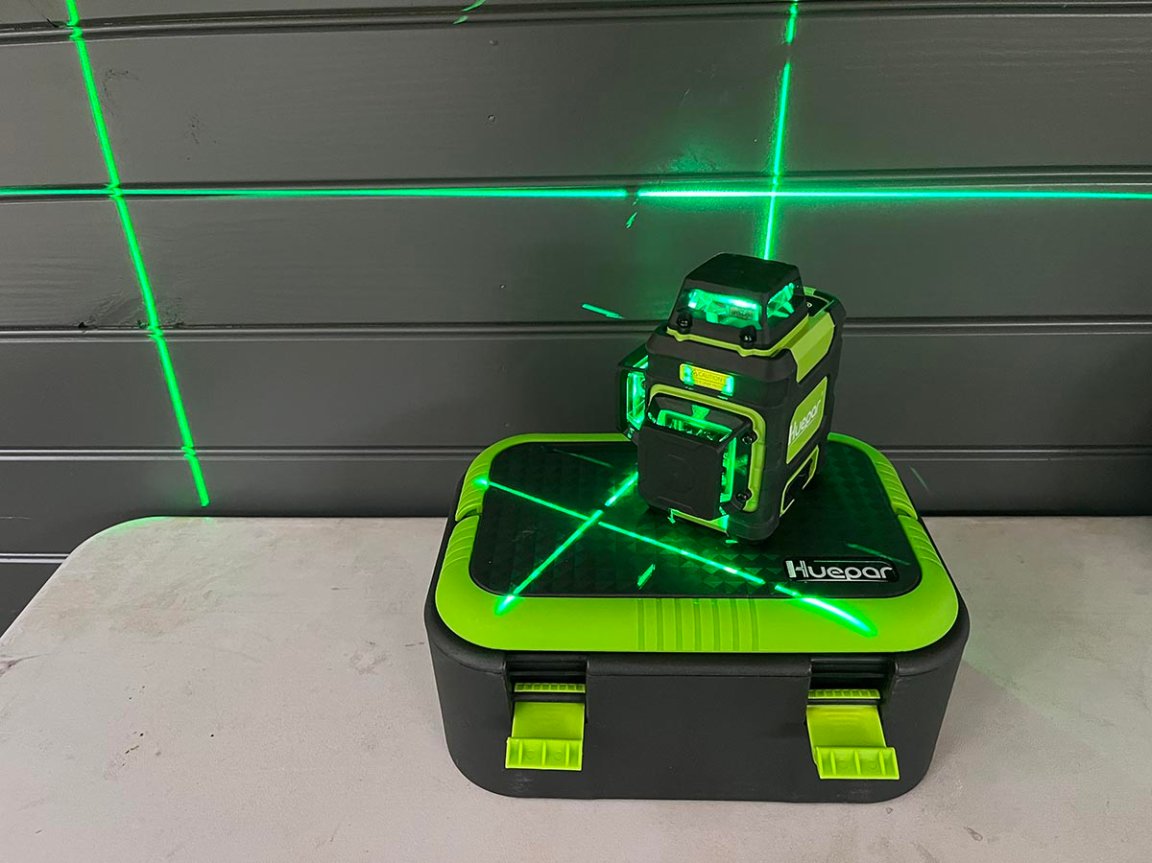We used this Huepar laser level to lay out footings and post bases for a deck. The green lasers were surprisingly bright in low light conditions, and worked well in midday shade, but became difficult to detect in bright sunlight (similar to other laser levels).