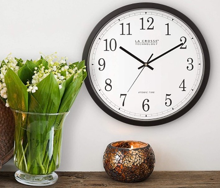 See ItLa Crosse Technology’s 14-Inch Wall Clock is an excellent overall clock that uses atomic time to stay accurate. This clock automatically adjusts for daylight saving time for four time zones. It has a classic look, with a white face and a black rim with easy-to-read numbers. The minute and hour hands are bold and easy to see, while the second hand ticks quietly and precisely. The clock measures time in hours, minutes, and seconds.
