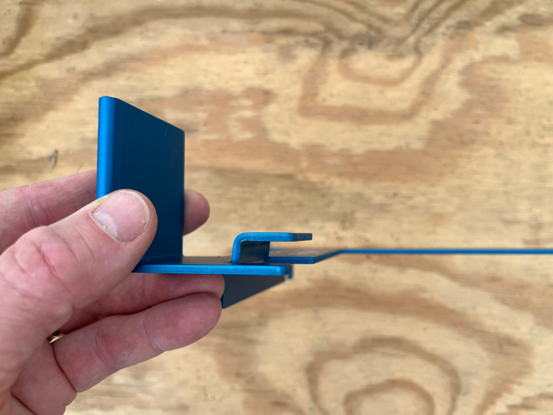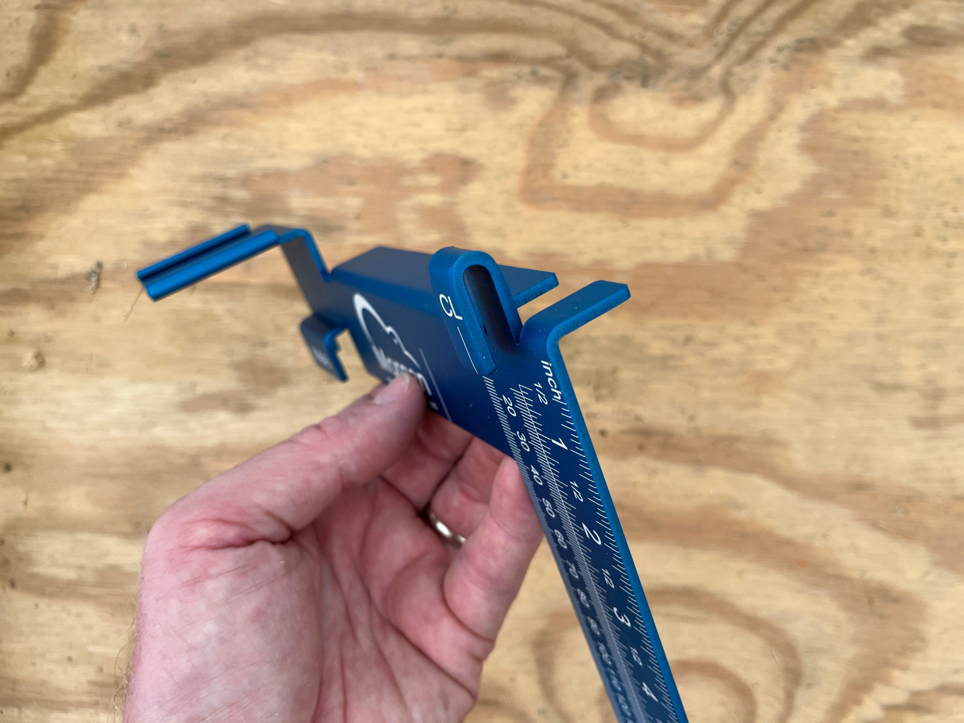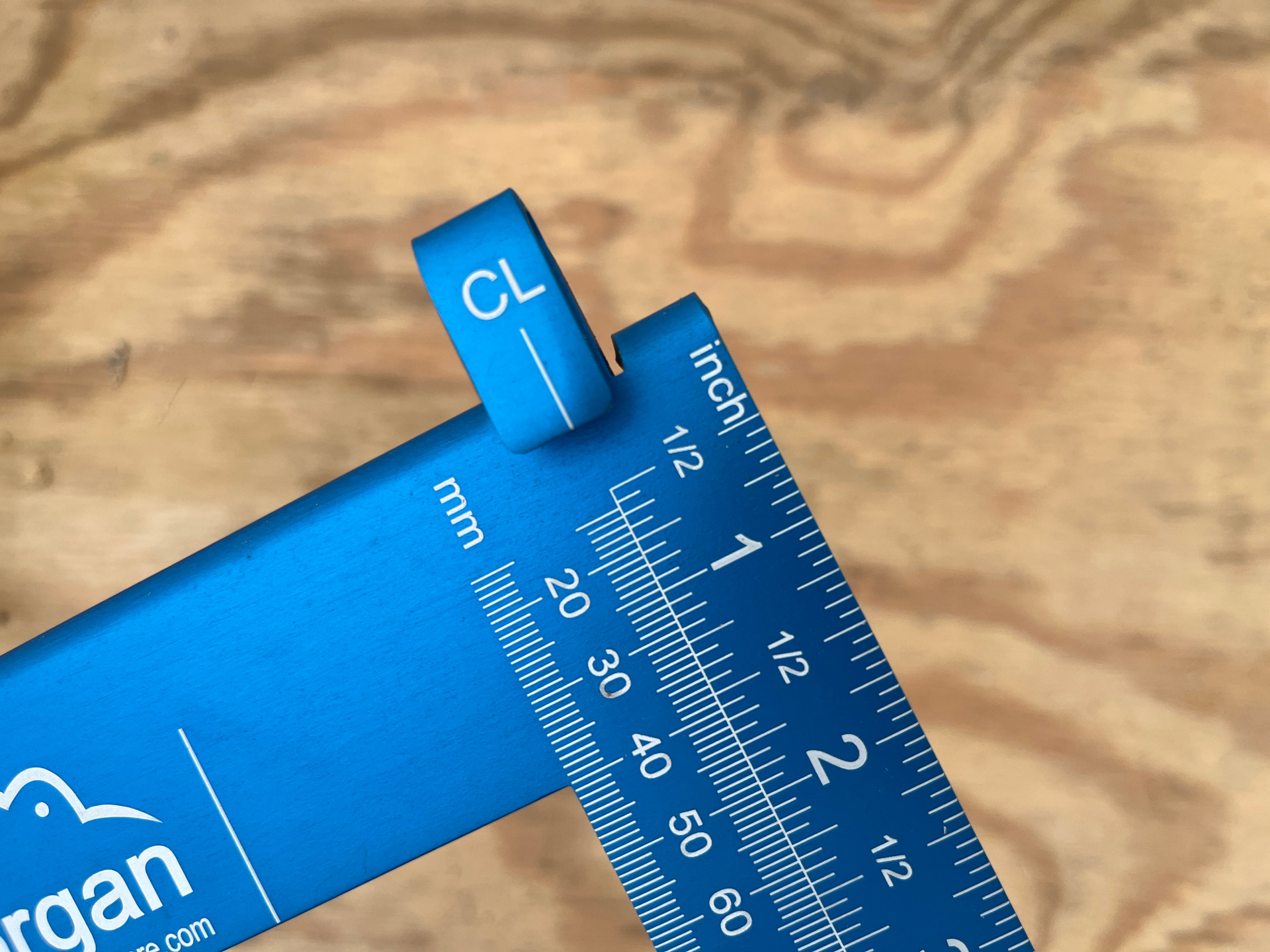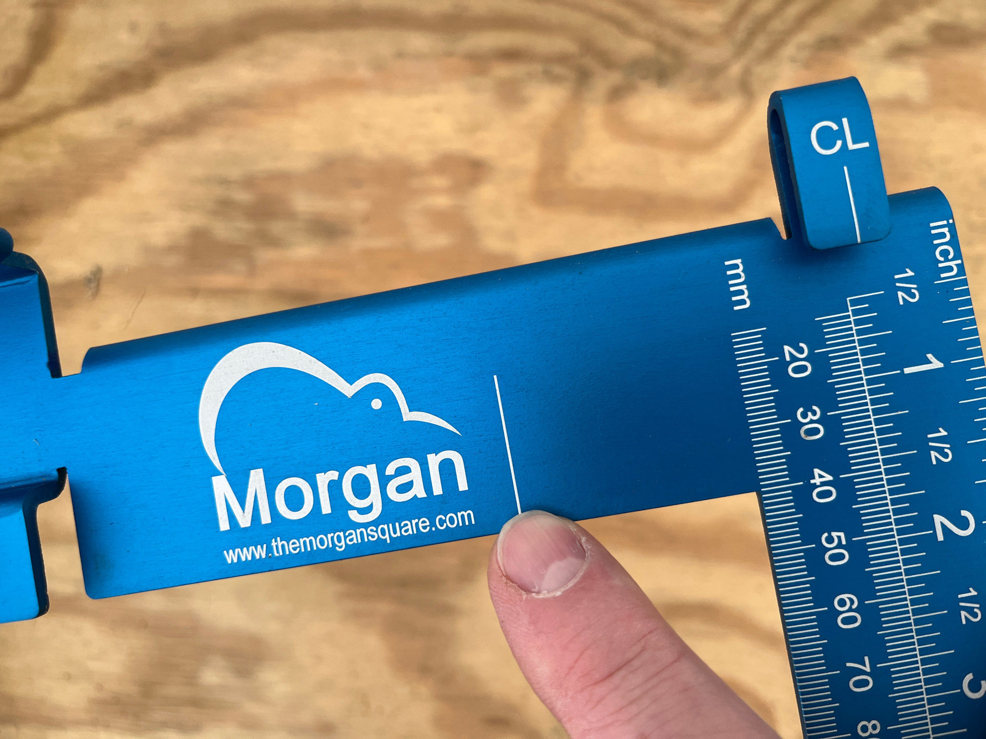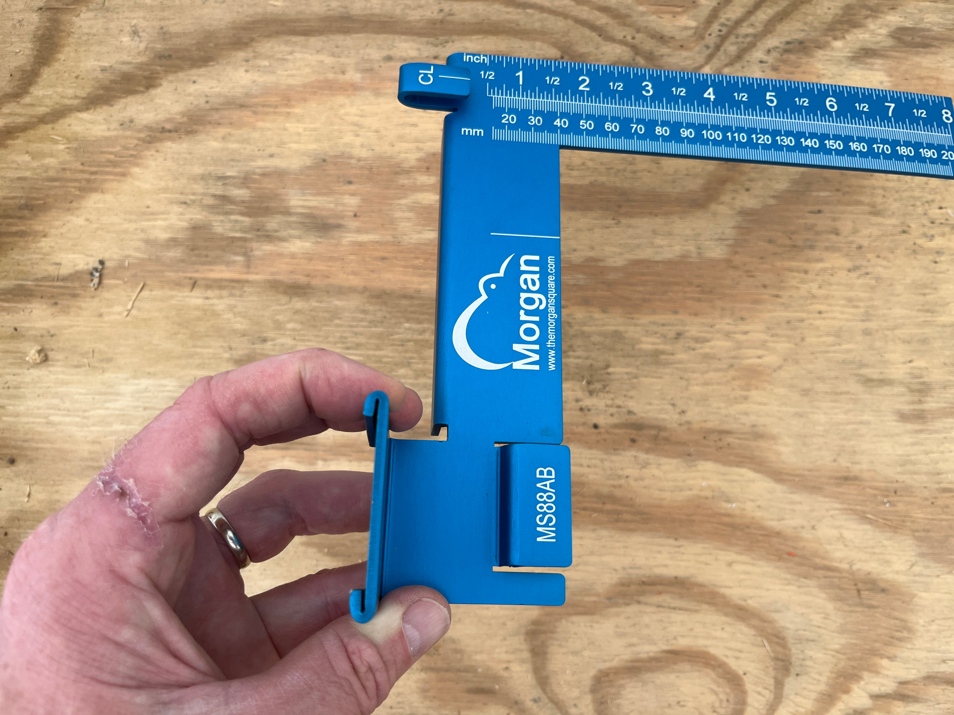 The Morgan Square was designed to turn measuring and marking into a one-step process by connecting the square and tape measure into a single unit. The square has tabs and slots that allow the user to physically connect their tape measure to the square so they’re not trying to manage two tools and a workpiece at the same time. To assemble the Morgan Square, insert the tape tab on the blade into the belt clip on the measuring tape, then extend the tape beneath a tab marked “CL” (center line) and allow the hook to rest over the edge of the tongue. There is also a slot to hold a pencil below the tape.