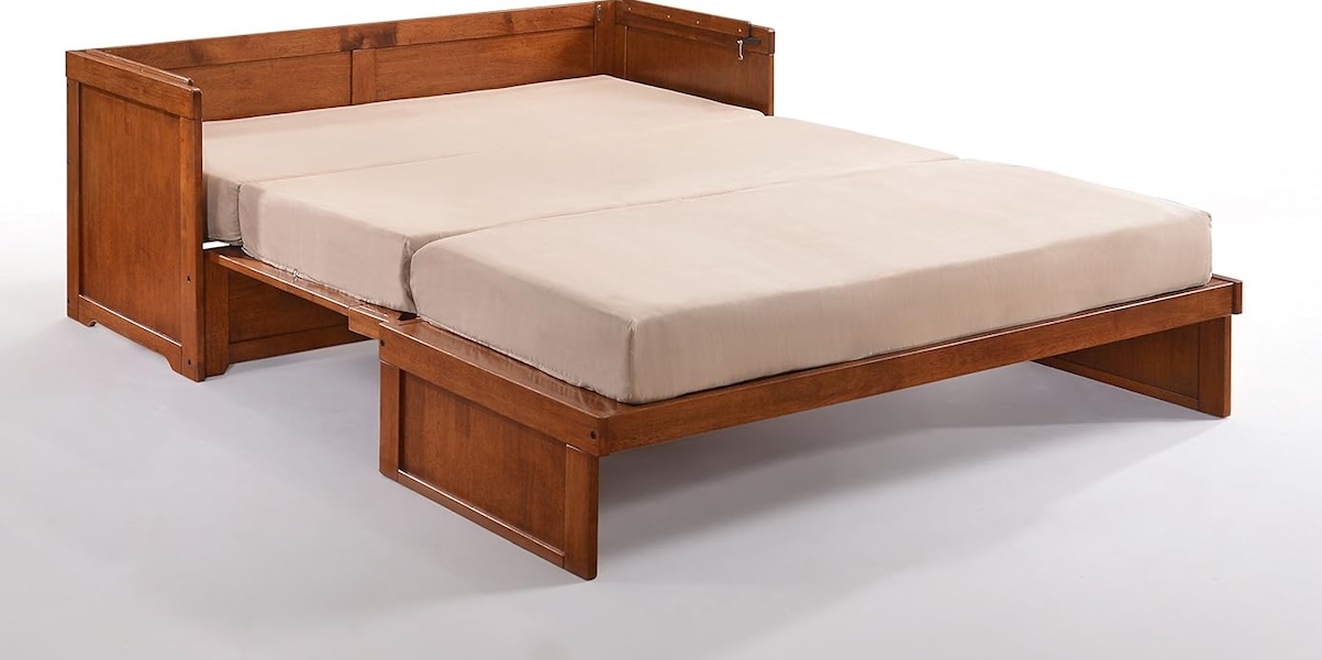 For years, Murphy beds were the Rodney Dangerfield of the furniture industry: they “got no respect,” often serving as a punchline on old sitcoms. But in today’s space-crunched society, the Murphy bed is finally coming back into its own as a stylish and chic alternative way to provide extra sleeping space. This Night & Day Furniture Murphy Cube Cabinet Bed is a perfect example, giving the appearance of an attractive hardwood storage cabinet while concealing a queen-size bed complete with a 6-inch, trifold, premium gel memory foam mattress. When closed, the cabinet measures 36.6 inches high by 64.1 inches wide and 26.4 inches long, taking up just 10 square feet of floor space; open, it measures 25.7 inches high by 64.1 inches wide and 80.3 inches long.